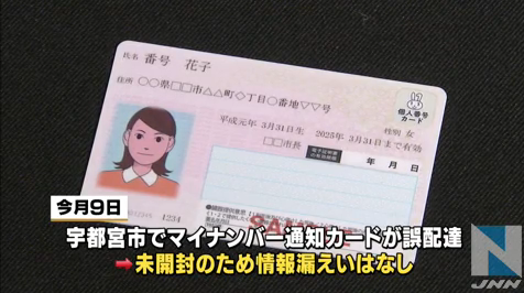 日本郵便東北支社は9日、郡山南郵便局(郡山市)で、マイナンバー通知カードを誤って別の住所に配達するミスが2件あったと発表した。県内で通知カードの誤配達が明らかになったのは、3例目。